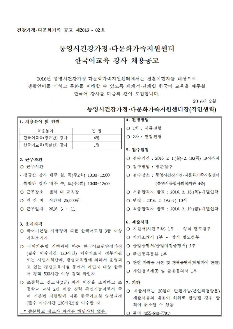 통영시건강가정·다문화가족지원센터 한국어교육 강사 채용 공고
