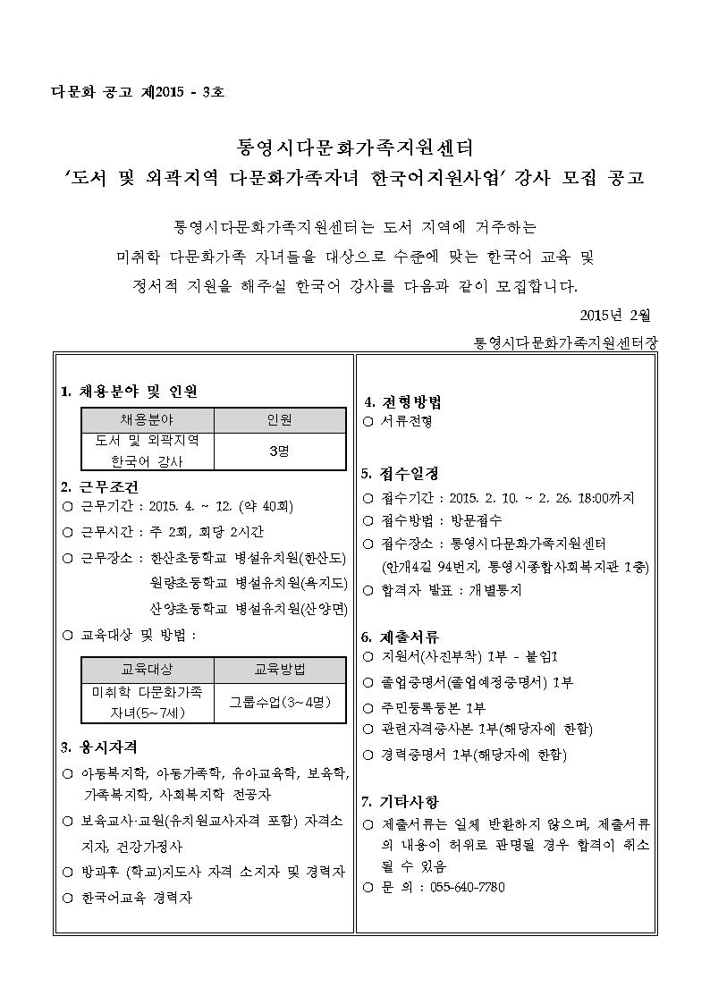 통영시다문화가족지원센터 도서 및 외곽지역 다문화가족자녀 한국어지원사업 강사 채용 공고