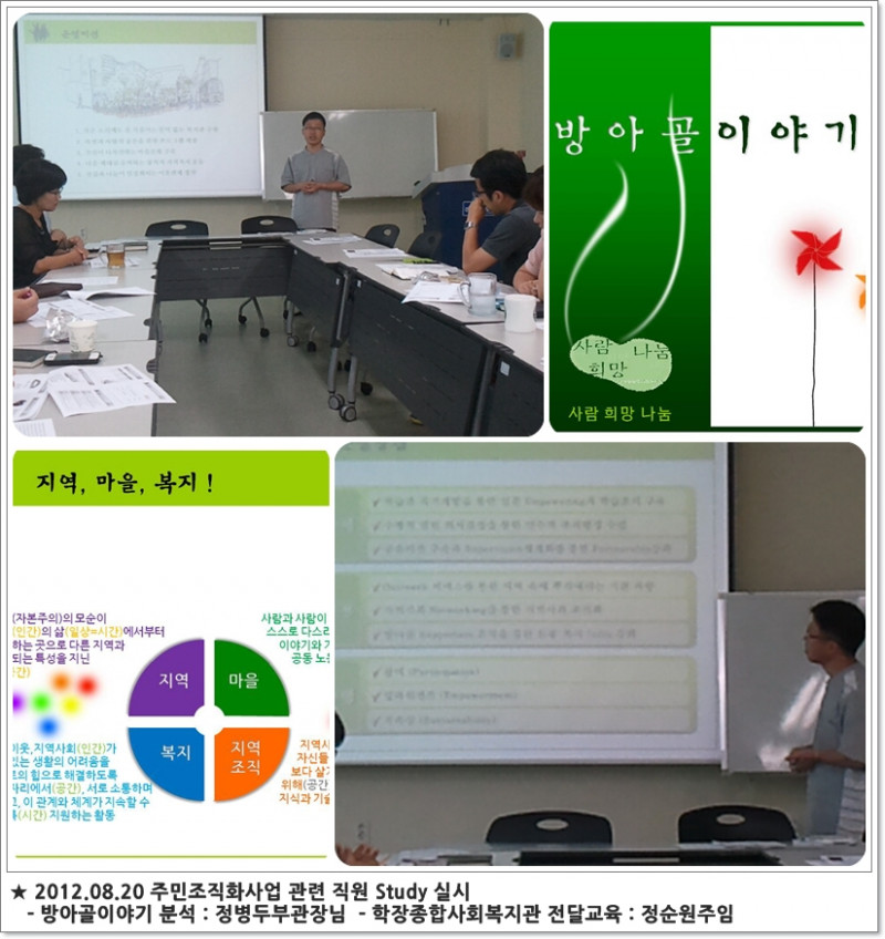 2012.08.20 16:00~18:00 / 교육실우리복지관에서는주민조직화사업 - 마을만들기와 관련하여방아골종합사회복지관의 방아골이야기와 학장종합사회복지관의 마을공동체를 중심으로내용 분석 및 Study를 하고 있습니다.앞으로 통영지역내 보여질 주민조직화 - 마을만들기가 어떤 모습을 할지 기대됩니다.
