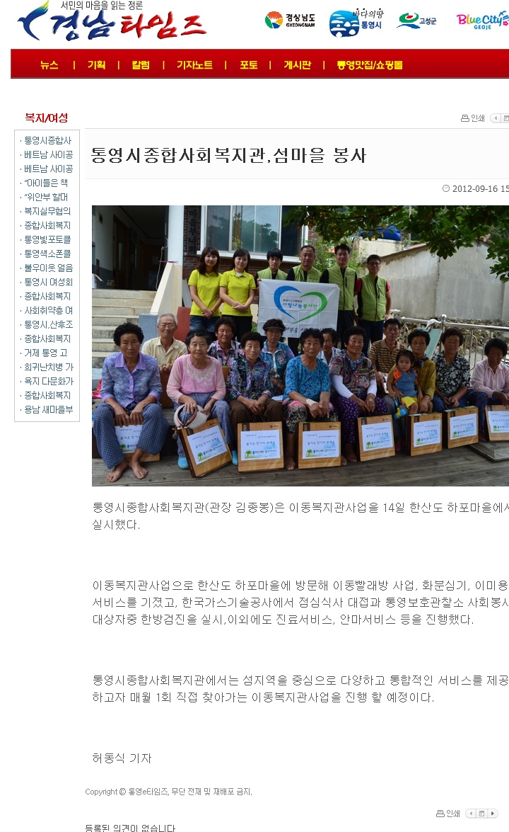 [경남타임즈] 통영시종합사회복지관, 섬마을 봉사