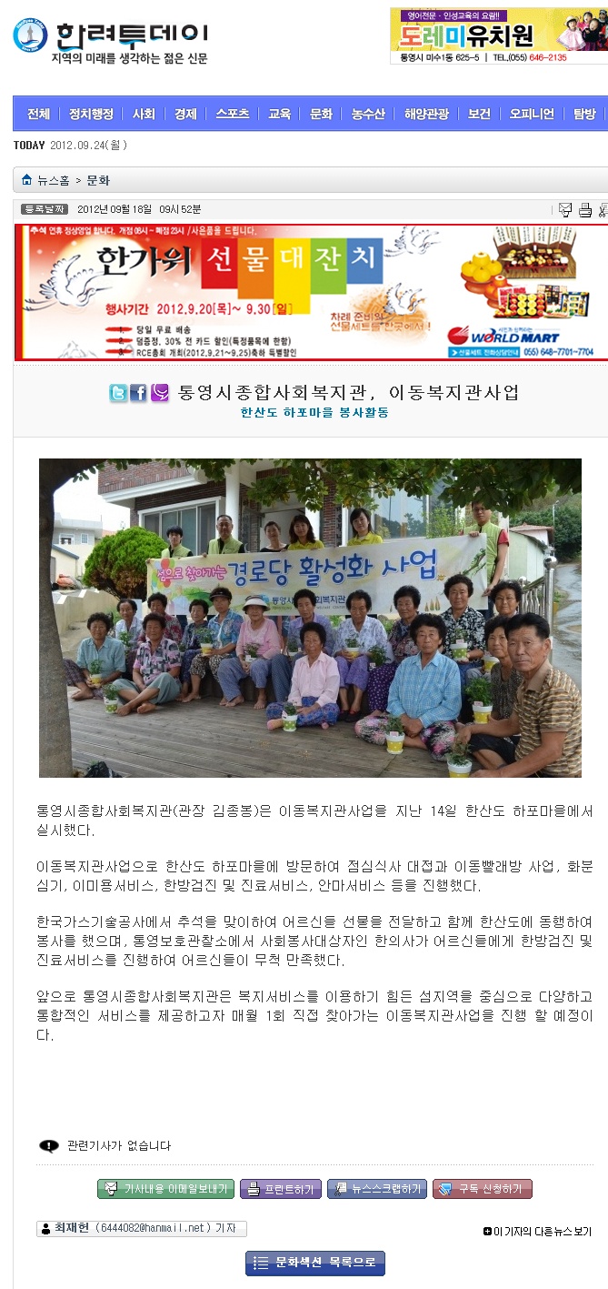 [한려투데이]통영시종합사회복지관, 이동복지관사업