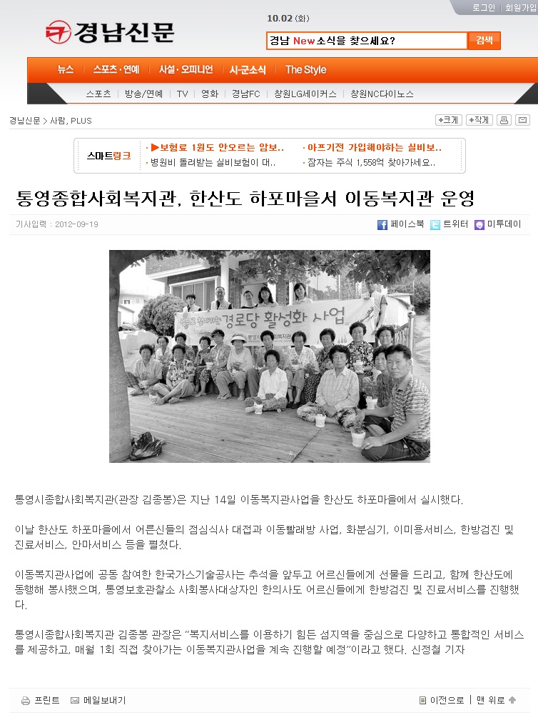 [경남신문]통영종합사회복지관, 한산도 하포마을서 이동복지관 운영